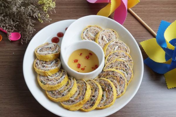 • Quấn phần trứng này vào giấy nến và cho vào hấp đến khi chín. Khi hấp xong nên để nguội và tiến hành cắt lát dày khoảng 1cm sau đó xếp ra đĩa.