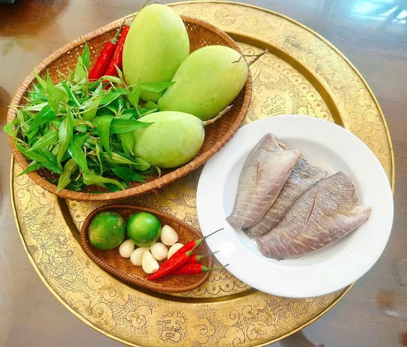 Gỏi xoài khô cá sặc món ăn đặc trưng của miền Tây có các nguyên liệu như sau: