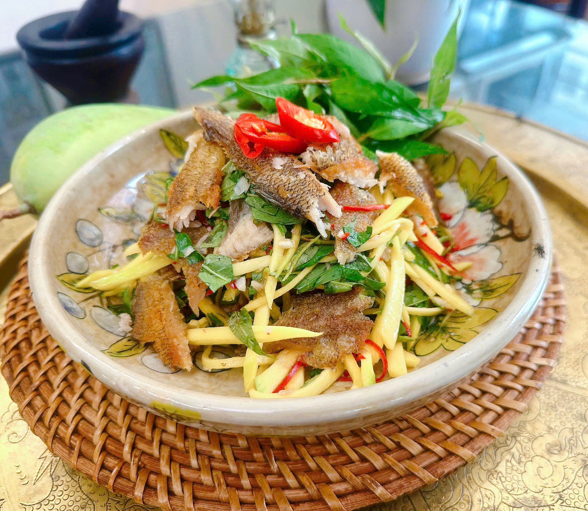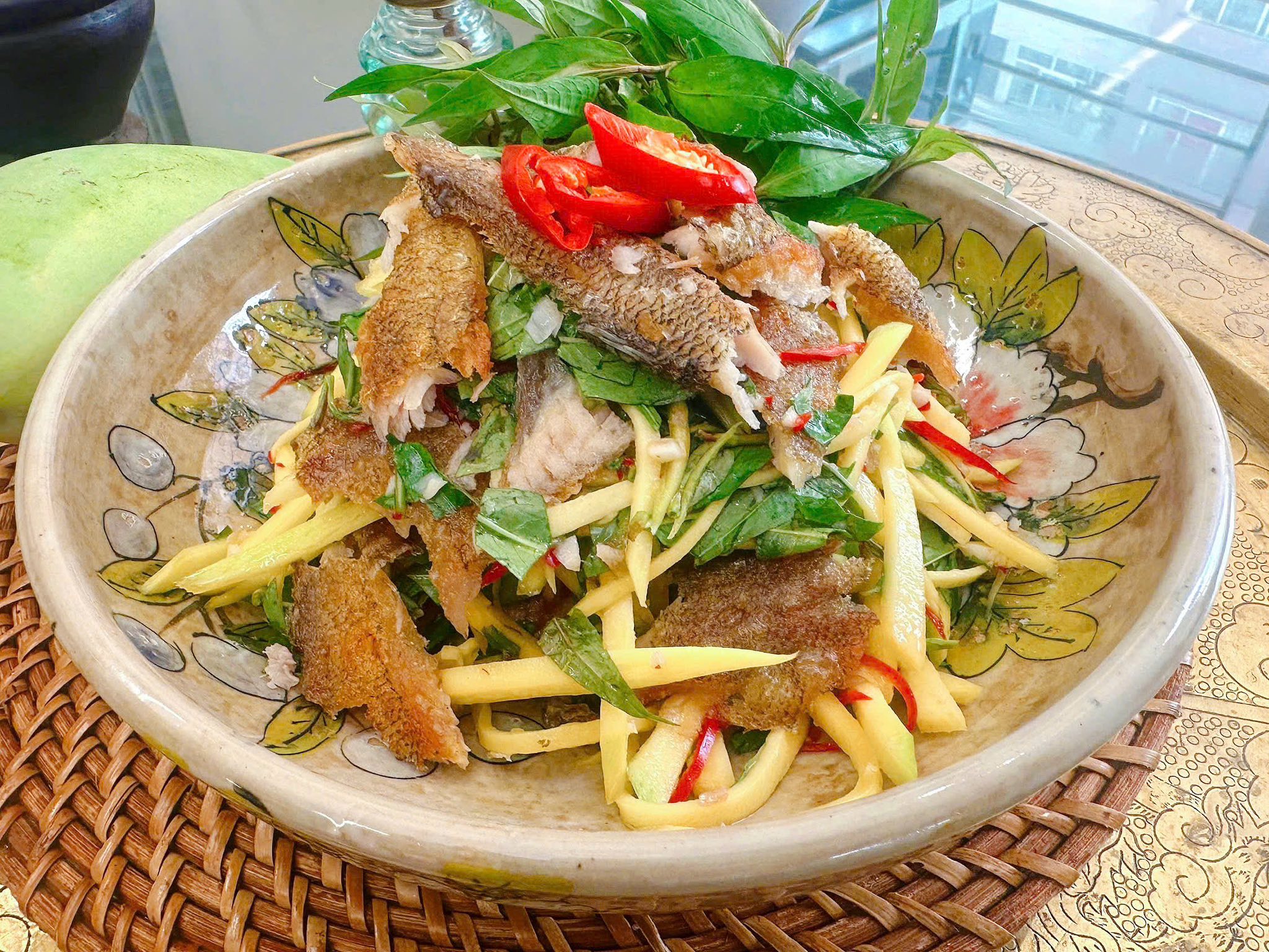 Xếp gỏi ra đĩa, trang trí thêm vài lát ớt tỉa hoa hoặc cà rốt cho đẹp mắt. Món gỏi xoài khô cá sặc ngon nhất khi ăn ngay – vị giòn của xoài xen lẫn vị đậm đà của cá, thơm bùi đậu phộng khiến bạn ăn hoài không chán.