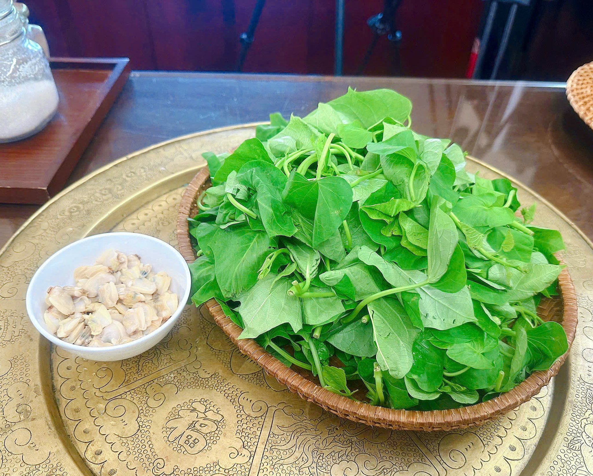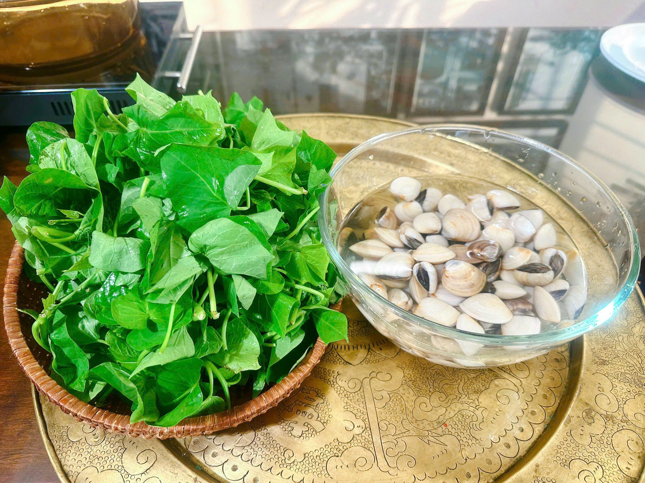 Sơ chế ngao và rau lang sạch sẽ
