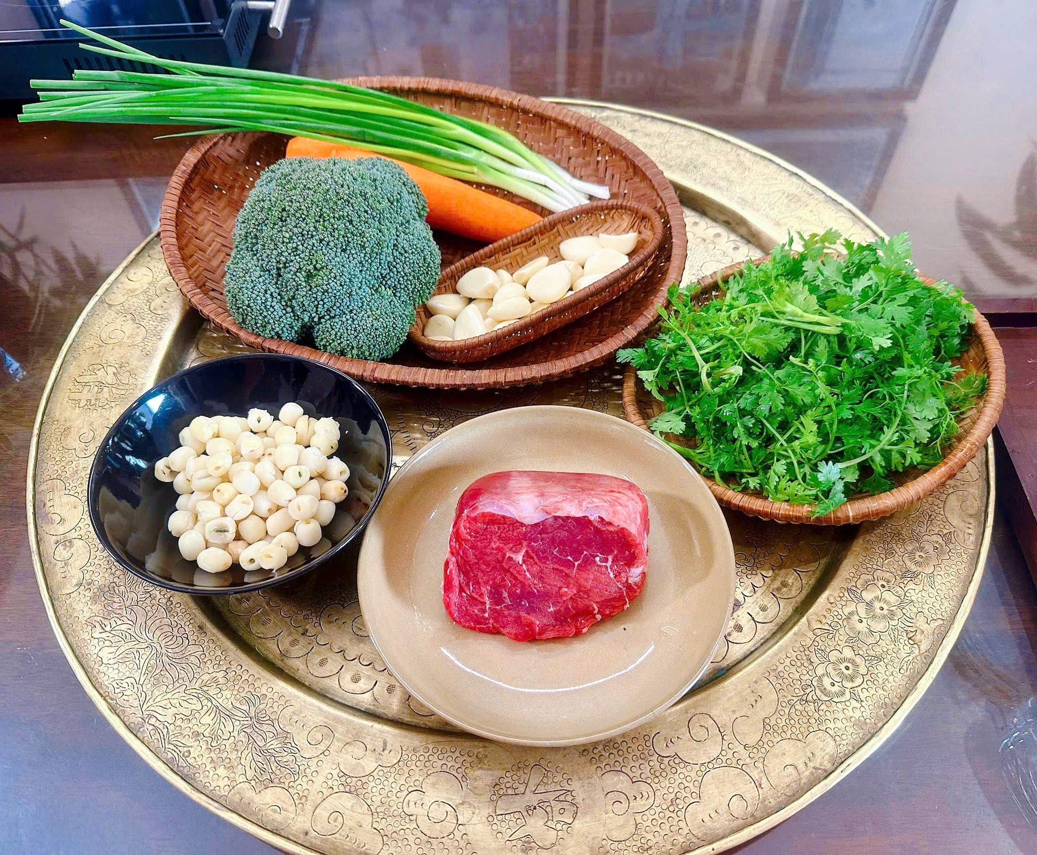 Màu sắc: Hoa lơ giữ màu trắng ngà hoặc xanh nhạt tươi tắn, không bị xỉn vàng. Thịt bò nâu bóng.