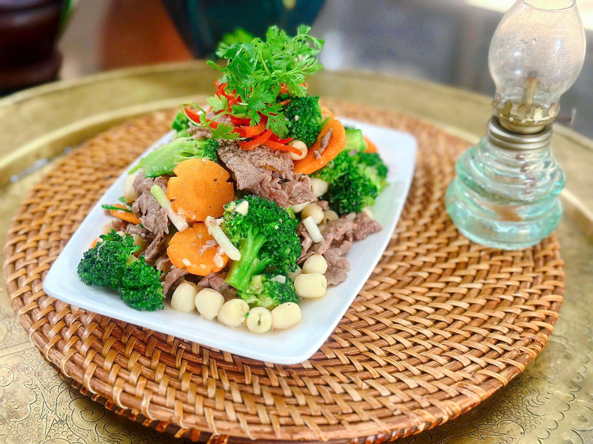 Kết cấu: Thịt bò mềm, mọng nước. Hoa lơ chín tới, cắn vào có độ giòn, ngọt tự nhiên.